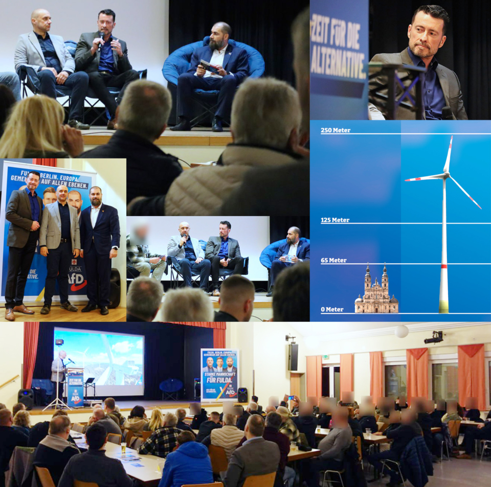 ⚜️ Der AfD-Spitzenkandidat für die Fuldaer Stadtverordnetenversammlung, FRANK SCHÜSSLER, verdeutlichte den Anwesenden die fatalen Folgen des Windparks für Mensch und Natur. In seiner detaillierten Präsentation beleuchtete er die politischen Hintergründe, den aktuellen Planungsstand und die massiven Auswirkungen, die der Bau von bis zu fünfzehn 250 Meter hohen Windrädern mitten im Wald mit sich bringt. Jede einzelne der Anlagen wird am Ende viermal so hoch sein wie der Fuldaer Dom ❗️